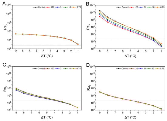 The predicted Rayleigh number (A) was based on the theoretical mean velocity derived from the temperature difference (ΔT), and Rayleigh numbers calculated based on ΔT between the heating temperature and the sample temperature at 1 cm (B), 4 cm (C), and 8 cm (D) vertically from the center of the bottom surface. Rap represents the predicted Rayleigh number, and Rae represents the calculated Rayleigh number. The labels 120, 31, and 10 correspond to the average particle sizes rounded to one decimal place, while 0.75 was rounded to three decimal places.
