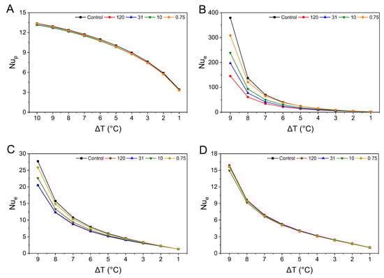 At 4 cm (Figure 7C), unlike the initial heating stage at 1 cm where Nue values exceeded 100, the Nue values at ΔT = 9 °C ranged between 20 and 30. This can be attributed to the location being 3 cm away from the heating region, where the temperature gradient is smaller [53]. The Nue values decreased as ΔT decreased. At ΔT = 9 °C, the control sample and the 0.75 sample exhibited the highest Nue values, but differences between samples were minimized when ΔT < 5 °C. The Rae value of 31 was consistently lower than that of 120, indicating that at this position, the temperature gradient, thermal boundary layer thickness, and convective effects do not exhibit a proportional relationship with particle size.