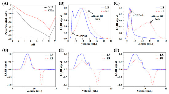 The zeta potential values of CGA and SGA were measured to understand their surface charge characteristics in aqueous solutions. Figure 1A shows both CGA and SGA exhibited negative zeta potentials, indicating that they carried negative surface charges within the measured pH range (2–9). However, it is important to note that zeta potential values represent the electric potential difference across the particle interface rather than the actual charge of the molecules. This electric potential differential is influenced by factors such as the ionic strength and pH of the medium, which can affect the distribution of ions around the particles. As the pH increased, both CGA and SGA exhibited a higher negative charge, likely due to the dissociation of carboxyl groups on the biopolymers’ surface, which is in agreement with findings from previous studies [12,26]. Figure 1B,C shows the plots of the refractive index (RI) and light scattering (LS) signals of CGA and SGA measured using GPC-MALLS analysis. The peaks of AGP and AG+GP can be detected on the RI signal curve of GPC-MALLS [21,27]. Figure 1D–F shows the plots of the RI and LS signals obtained from HPMC solutions of different viscosities. A clear molecular weight distribution was observed at an outflow volume of 5 to 10 mL. While the RI signal showed an inverted peak after 10 mL, the LS signal did not show any peak. This indicated that the solvent peak between 10 and 15 mL did not affect the overall experimental results.