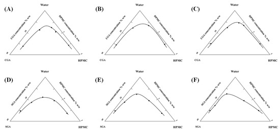 (A–C) Separation phase diagrams of CGA and 100, 15,000, and 100,000 mPa·s HPMC and water system. (D–F) Separation phase diagrams of SGA and 100, 15,000, and 100,000 mPa·s HPMC and water system.