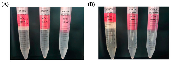 (A) Phase separation in the CGA/HPMC mixtures with different viscosities and a fixed concentration ratio of 6% CGA/1% HPMC. (B) Phase separation in the SGA/HPMC mixtures with different viscosities and a fixed concentration ratio of 8% SGA/1% HPMC. (CGA, SGA/100 mPa·s, CGA, SGA/15,000 mPa·s, and CGA, SGA/100,000 mPa·s [from left to right]).