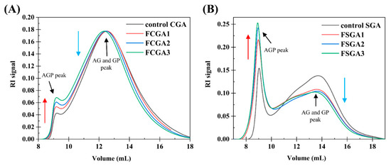 (A) RI profiles based on the GPC-MALLS analysis of control CGA and a series of AGP-rich CGA products. (B) RI profiles based on the GPC-MALLS analysis of control SGA and a series of AGP-rich SGA products. A series of AGP-rich CGA and SGA products were obtained through varying degrees of phase separation from HPMC. Note: control CGA (or SGA): CGA (or SGA) without phase separation; FCGA1: 6% CGA and 1% 100 mPa·s HPMC blend; FCGA2: 6% CGA and 1% 15,000 mPa·s HPMC blend; FCGA3: 6% CGA and 1% 100,000 mPa·s HPMC blend; FSGA1: 8% SGA and 1% 100 mPa·s HPMC blend; FSGA2: 8% SGA and 1% 15,000 mPa·s HPMC blend; FSGA3: 8% SGA and 1% 100,000 mPa·s HPMC blend.