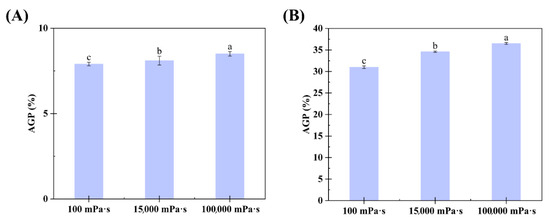 The AGP content in the CGA- and SGA-enriched phases of each formulation was calculated using GPC-MALLS software (version 4.90.08, Wyatt Technology Corporation, USA). The AGP content in the CGA and SGA phases increased significantly with the viscosity of HPMC, from 7.9% and 31% in the 100 mPa·s HPMC system to 8.5% and 36.5% in the 100,000 mPa·s HPMC system, respectively, as shown in Figure 5A,B. This was consistent with the color changes and GPC-MALLS RI curves observed in previous experiments. Thus, the findings showed that viscosity can affect the degree of fractionation in GA, with the tendency of AGP to enter the CGA- or SGA-enriched phase increasing with a rise in HPMC viscosity. When HPMC of the lowest viscosity (100 mPa·s) was used, the AGP level in the CGA-enriched phase (7.9%) was similar to that in the control CGA (6.3%) solution. In contrast, under these conditions, the AGP level in the SGA-enriched phase (31%) was much higher than that in the control SGA solution (27.3%). This could be because the molecular weight of SGA was much higher than that of CGA, and the molecular weight is also a key determinant of the degree of phase separation [36].