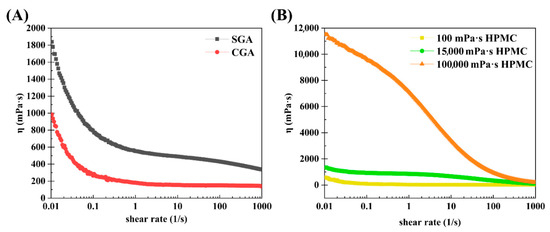 The steady-state shear method described in Section 2.7 was employed to determine how viscosity affects the shear rate of CGA, SGA, 100 mPa·s HPMC, 15,000 mPa·s HPMC, and 100,000 mPa·s HPMC. Figure 6A shows the steady-state shear flow curves of CGA and SGA in water at fixed concentrations of 30%. Each of the flow curves demonstrated a shear thinning phenomenon at lower shear rates, and a viscosity plateau was observed at higher shear rates. SGA had a higher viscosity than CGA at the same shear rate due to its higher Mw and Rg [37]. Figure 6B shows the steady-state shear flow curves of the three different HPMC solutions in water, each with a fixed concentration of 1% and different viscosities. Notably, HPMC also exhibited shear thinning at all three viscosities. The flow curves of 100 mPa·s HPMC and 15,000 mPa·s HPMC demonstrated a very low viscosity curve at the same concentration. That was due to the low molecular weight and polymer structure [38,39].