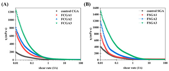 Steady-state shear viscosity as a function of shear rate for GA-enriched phases after the phase separation of CGA (A) and SGA (B) from HPMC with different viscosities. Note: FCGA1: 6% CGA and 1% 100 mPa·s HPMC blend; FCGA2: 6% CGA and 1% 15,000 mPa·s HPMC blend; FCGA3: 6% CGA and 1% 100,000 mPa·s HPMC blend; FSGA1: 8% SGA and 1% 100 mPa·s HPMC blend; FSGA2: 8% SGA and 1% 15,000 mPa·s HPMC blend; FSGA3: 8% SGA and 1% 100,000 mPa·s HPMC blend.