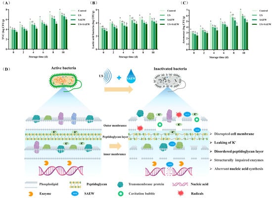 Effect of ultrasonic-assisted slightly acidic electrolyzed water on the counts of total viable (A), Aeromonas bacteria (B), lactic acid bacteria (C), and possible disinfection mechanism (D) in refrigerated mirror carp fillets. Control: no treatment; US: ultrasonic treatment; SAEW: slightly acidic electrolyzed water treatment; US+SAEW: ultrasonic-assisted slightly acidic electrolyzed water treatment. The means at the same storage time with different letters differ significantly (p < 0.05).