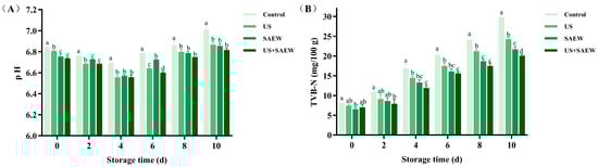 Effect of ultrasonic-assisted slightly acidic electrolyzed water on pH (A) and total volatile basic nitrogen (TVB-N) (B) in refrigerated mirror carp fillets. Control: no treatment; US: ultrasonic treatment; SAEW: slightly acidic electrolyzed water treatment; US+SAEW: ultrasonic-assisted slightly acidic electrolyzed water treatment. The means at the same storage time with different letters differ significantly (p < 0.05).