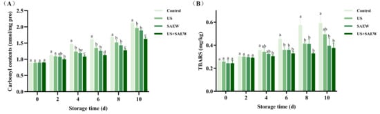 Effect of ultrasonic-assisted slightly acidic electrolyzed water on protein carbonyl content (A) and thiobarbituric acid reactive substance (TBARS) (B) in refrigerated mirror carp fillets. Control: no treatment; US: ultrasonic treatment; SAEW: slightly acidic electrolyzed water treatment; US+SAEW: ultrasonic-assisted slightly acidic electrolyzed water treatment. The means at the same storage time with different letters differ significantly (p < 0.05).