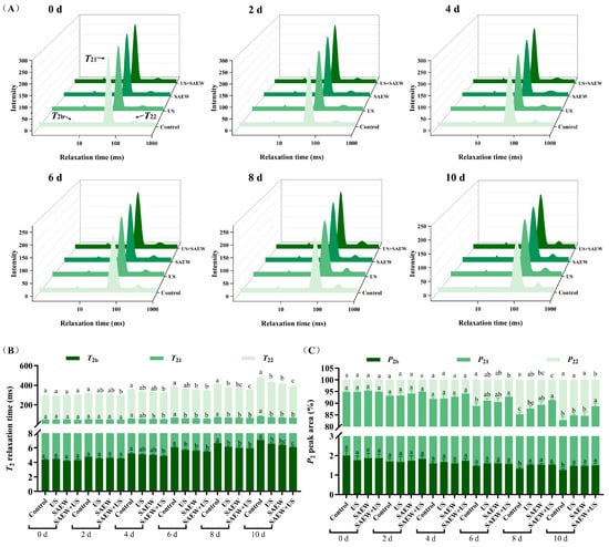 Effect of ultrasonic-assisted slightly acidic electrolyzed water on water distribution (A), T2 relaxation time (B) and water peak area (C) in refrigerated mirror carp fillets. T2b: bound water; T21: immobilized water; T22: free water; P2b: percentage of bound water; P21: percentage of immobilized water; P22: percentage of free water. Control: no treatment; US: ultrasonic treatment; SAEW: slightly acidic electrolyzed water treatment; US+SAEW: ultrasonic-assisted slightly acidic electrolyzed water treatment. The means at the same storage time with different letters differ significantly (p < 0.05).