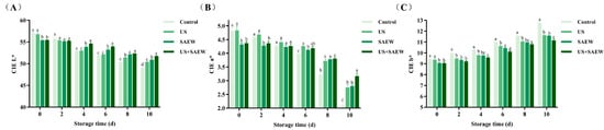 Effect of ultrasonic-assisted slightly acidic electrolyzed water on CIE L* (A), a* (B) and b* (C) in refrigerated mirror carp fillets. Control: no treatment; US: ultrasonic treatment; SAEW: slightly acidic electrolyzed water treatment; US+SAEW: ultrasonic-assisted slightly acidic electrolyzed water treatment. The means at the same storage time with different letters differ significantly (p < 0.05).