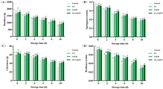 Effect of ultrasonic-assisted slightly acidic electrolyzed water on hardness (A), springiness (B), chewiness (C) and resilience (D) in refrigerated mirror carp fillets. Control: no treatment; US: ultrasonic treatment; SAEW: slightly acidic electrolyzed water treatment; US+SAEW: ultrasonic-assisted slightly acidic electrolyzed water treatment. The means at the same storage time with different letters differ significantly (p < 0.05).