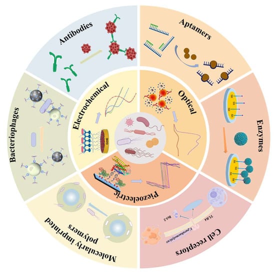 A biosensor is composed of three main components: a recognition element, a transducer, and a signal processing system. Among them, the recognition element determines the specificity of the sensor. Commonly used recognition elements include antibodies, aptamers, nucleic acids, enzymes, cell receptors, molecularly imprinted polymers (MIPs), and bacteriophages. The transducer is responsible for converting the biological signals generated by the interaction between the recognition element and the target pathogen into detectable physical or chemical signals—such as those based on electrochemical, optical, or mass-sensitive principles. The signal processing system amplifies, analyzes, and outputs these signals to enable qualitative or quantitative detection of pathogens [,,].