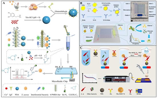 (A) Illustration of the proposed immunosensor for S. aureus detection []. Copyright 2022, Elsevier. (B) Schematic diagram of a microfluidic biosensor for rapid detection of S. typhimurium based on magnetic separation, enzymatic catalysis, and electrochemical impedance analysis []. Copyright 2022, Elsevier. (C) Schematic diagram of the sandwich model composed of Mn-MOF-74 impedance probe and immunomagnetic beads for the detection of L. monocytogenes []. Copyright 2021, Elsevier.