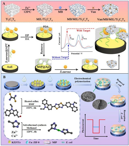 (A) Hybrid recognition-enabled ratiometric electrochemical sensing of S. aureus via in situ growth of MOF/Ti3C2Tx-MXene and a self-reporting bacterial imprinted polymer []. Copyright 2025, Elsevier. (B) Preparation process of MIP-PEC sensor and schematic illustration of its photoelectric detection mechanism for E. coli []. Copyright 2024, Elsevier.