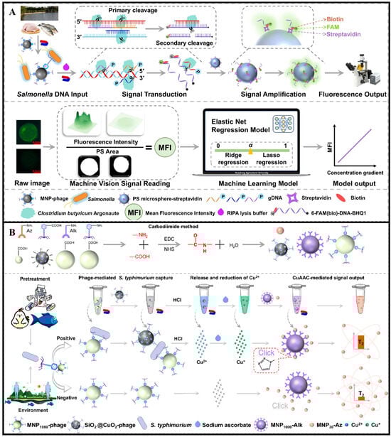 (A) Schematic diagram of machine vision-assisted Argonaute-mediated fluorescent biosensor for detection of live Salmonella in food []. Copyright 2024, Elsevier. (B) Schematic diagram of a CuO2@SiO2 nanoparticle-assisted click reaction-mediated magnetic relaxation biosensor for the rapid detection of Salmonella in food []. Copyright 2025, Elsevier.