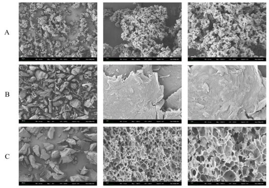 SEM images of carboxymethyl chitosan (A), sodium alginate (B), and carboxymethyl chi tosan/sodium alginate composite (C) materials.