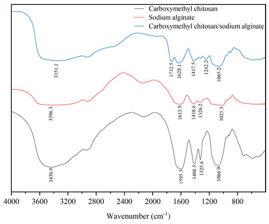 Infrared spectra of carboxymethyl chitosan (CC), sodium alginate (SA), and carboxymethyl chitosan/sodium alginate composite (CC-SA) materials.