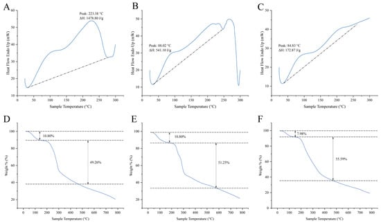 DSC thermal characteristic map of carboxymethyl chitosan (A), sodium alginate (B), and carboxymethyl chitosan/sodium alginate composite materials (C). TG curves of carboxymethyl chitosan (D), sodium alginate (E), and carboxymethyl chitosan/sodium alginate composite materials (F).