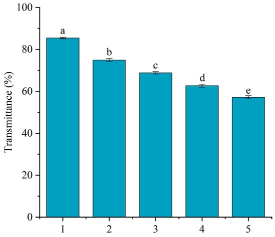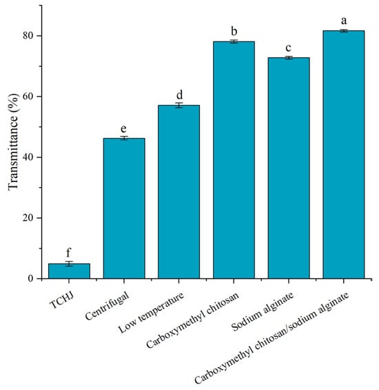 As shown in Figure 4, the transmittance of untreated TCHJ was only 4.93%. However, all clarification treatments led to a significant increase in transmittance (p < 0.05). Among the tested methods, the use of the CC–SA composite exhibited the most effective clarification performance, elevating the transmittance to 81.67%, followed by CC alone (78.14%), SA alone (72.81%), low-temperature clarification (57.13%), and standard centrifugation (46.32%). Notably, the CC–SA composite outperformed both of its individual components, indicating a synergistic interaction between carboxymethyl chitosan and sodium alginate in enhancing juice clarity. These results suggest that the CC–SA composite provides better clarification performance (81.67%) for fruit juice than previously reported methods using bentonite (76.09%) [25] and conventional limed–carbonated (78.26%) [26] treatment.