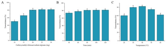 Effects of carboxymethyl chitosan/sodium alginate composite material dosage (A), adsorption time (B), and temperature (C) on clarification of TCHJ. Different lowercase letters (a–d) indicate significant differences at p < 0.05.