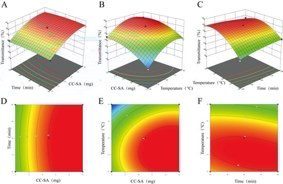 Response surface and contour plots illustrating the interaction effects between two variables on the clarification performance. (A,D) Interaction between CC-SA dosage and adsorption time; (B,E) Interaction between CC-SA dosage and adsorption temperature; (C,F) Interaction between adsorption time and adsorption temperature. (A–C) the red points represent that design points above predicted value; the pink points represent that design points below predicted value. (D–F) the closer to the central area (red), the higher the transmittance; the closer to the edge area (green), the lower the transmittance.