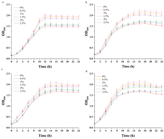 Effect of LHPs on probiotic growth curves. ((a) L. plantarum DNZ-4, (b) L. lactis L1, (c) L. casei 0.8072, (d) L. rhamnosus L08). Note: The same letter indicates no significant difference between groups (p < 0.05), while different letters indicate a significant difference between groups (p > 0.05).
