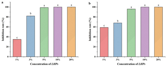 MIC of LHPs. ((a) Inhibition rate of LHPs against E. coli IQCC10126; (b) Inhibition rate of LHPs against S. aureus ATCC13565). Note: The same letter indicates no significant difference between groups (p < 0.05), while different letters indicate a significant difference between groups (p > 0.05). (The same as above).