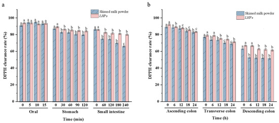 Changes in DPPH clearance rates, (a) in the mouth, stomach, small intestine; (b) in the colon. Note: The same letter indicates no significant difference between groups (p < 0.05), while different letters indicate a significant difference between groups (p > 0.05).