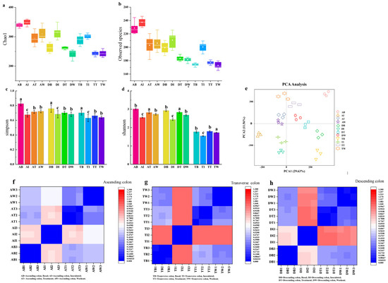 Diversity analysis of intestinal flora. (a) Chao 1 index, (b) Observed Species index, (c) Shannon index, (d) Simpson index, (e) PCA analysis, (f) ascending colon, (g) transverse colon, (h) descending colon. Note: The same letter indicates no significant difference between groups (p < 0.05), while different letters indicate a significant difference between groups (p > 0.05).