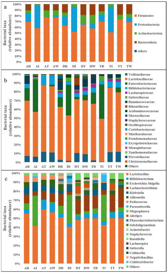 Changes in gut microbiota during in vitro simulated digestion. (a) At the phylum level; (b) at the family level; (c) at the genus level). Note: AB, AI, AT, AW, TB, TI, TT, TW, DB, DI, DT, and DW’s annotations are the same as above.