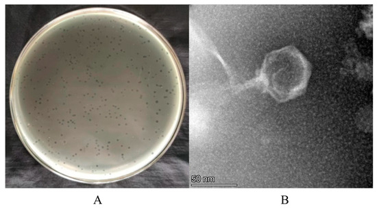 The isolation of phage XY75 was conducted from sewage samples collected from an effluent treatment plant in Hefei, China as described previously, with minor modifications [20]. Most bacteria were removed by vacuum filtration of sewage through a 0.45 µm filter membrane (Jin Jing, Shanghai, China) using a recirculating water vacuum pump (Great Wall, Zhengzhou, China); subsequently, the mixture was vacuum-filtered through a 0.22 µm filter membrane (Jin Jing, Shanghai, China) to collect phage particles, which were then eluted via ultrasonication. The suspension was subjected to filtration through a 0.45 µm filter (Jin Teng, Tianjin, China). An equal volume of Luria–Bertani (LB) broth (Haibo Microbial, Qingdao, China) supplemented with 2 mM CaCl2 was added to the phage suspension, followed by inoculation with 50 µL of the bacterial strain described in Section 2.1 of the log phase. The culture was then incubated with shaking at 37 °C for 8 h. After centrifugation (4000× g, 5 min), the supernatant was collected for phage titer determination using the double-layer agar method (the bottom layer was 1.5% TSA (HuanKai Microbial, Guangzhou, China) solid medium and the upper layer was 0.4% TSB soft agar layer containing bacteria). A single translucent phage plaque was picked, resuspended in SM buffer (50 mM Tris-HCl, 100 mM NaCl, 10 mM MgSO4, pH 7.5), and mixed thoroughly. Homogeneous plaque morphology was observed following 3–4 rounds of purification using the double-layer agar technique.