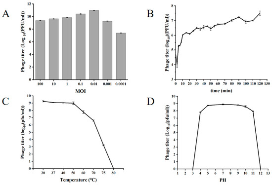Biological characterization of phage XY75. (A) MOI. (B) One-step growth curve. (C) Temperature stability. (D) pH stability.
