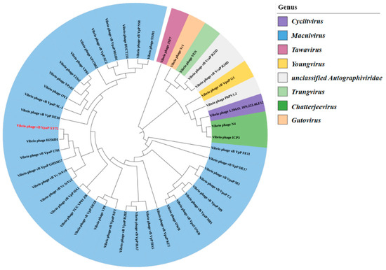 Illumina sequencing determined the double-stranded DNA (dsDNA) genome of bacteriophage XY75 to be 44,860 bp in length, with a GC content of 48.68%. The results of BLASTn comparison showed that the similarity between phage XY75 and Vibrio phage vB_VpaP_MGD1 (MT501516.1) was 100% (96.03% coverage); the similarity between phage XY75 and Vibrio phage vB_VpaP_1701 (ON872379) was 98% (95.28% coverage). The VIRIDIC heatmap (Figure 3) showed that phage XY75 exhibited significant intergenomic similarity with other vibrio phages. Furthermore, no antibiotic resistance genes (ARGs) or virulence-associated genes (VAGs) were detected in the genome of phage XY75. The morphology of phage XY75 particles and functional analysis of its predicted gene products suggested that it is a characteristic member of the Myoviridae family. Possessing its own RNA polymerase (ORF 29), ICTV classification places this phage within the Autographiviridae subfamily (Figure 4). Consequently, the genomic sequences of 43 Autographivirina Vibrio phages were downloaded from the ICTV database for the purpose of phylogenetic-tree analysis. Phylogenetic-tree analysis revealed that XY75 clustered within the branch of the Maculvirus genus, consistent with the whole-genome similarity result.