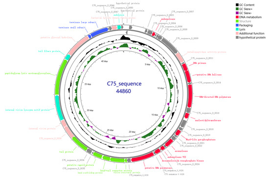 Genome-wide mapping of XY75. Circles from outside to inside: (1) ORFs are indicated in the first and second circles. The direction of the arrow, whether clockwise or counterclockwise, is indicative of the direction of the forward (or reverse) chain coding. For the open reading frames, different colors represent functional categories: hypothetical proteins (grey), DNA metabolism (red), structure (green), packaging (blue), lysis (cyan), and additional function (pink). (2) The third circle is indicative of the GC content of the genome. (3) The fourth circle is indicative of the value of (G − C)/(G + C), which is representative of the GC skew plot that is used to measure the relative contents of G and C (green indicates high GC content; purple indicates low GC content). (4) The innermost circle represents the total length of the genome, expressed in kilobase pairs (Kb).