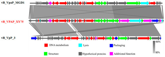 Genome comparison of vB_VPAP_XY75, vB_VpaP_MGD1, vB_VpP_3, and EBPL using Easyfig. The different color arrows represent predicted open reading frames with different functions: hypothetical proteins (grey), DNA metabolism (red), structure (green), packaging (blue), lysis (cyan), and additional function (pink). Shading indicates nucleotide identity between sequences (92–100%).