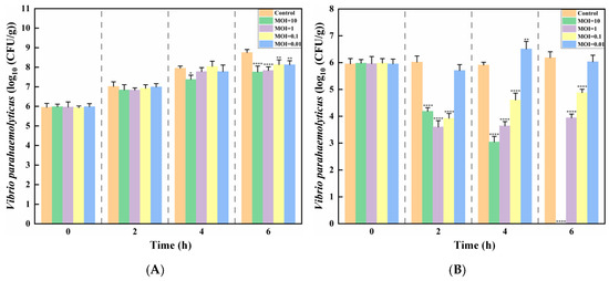 Bacteriostatic effects of phage XY75 on V. parahaemolyticus in salmon. (A) Salmon, 37 °C; (B) salmon, 4 °C. (*) indicates p < 0.05, (**) indicates p < 0.01, (****) indicates p < 0.0001.