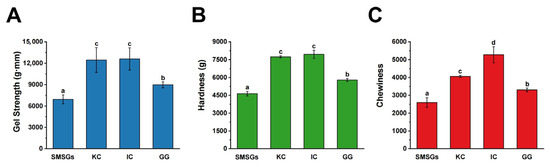 Figure 1. Gel properties of SMSGs modified by KC, IC, and GG. (A) Gel strength. (B) Hardness. (C) Chewiness. Different letters (a–d) suggest significant differences (p < 0.05) among the groups.