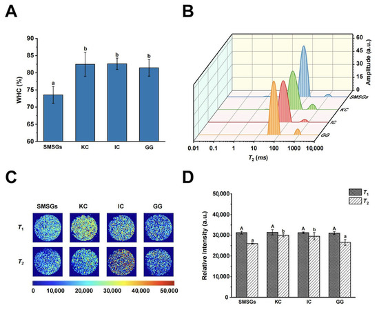 Figure 2. Water status of SMSGs modified by KC, IC, and GG. (A) WHC. (B) T2 relaxation time profiles. (C) T1 and T2 weight images. (D) Relative intensity of T1 and T2 weight images. The capital letter (A) was utilized to imply the significant difference in T1 (p < 0.05) among the groups, and the small letters (a–b) were utilized to imply the significant difference in WHC and T2 (p < 0.05) among the groups.