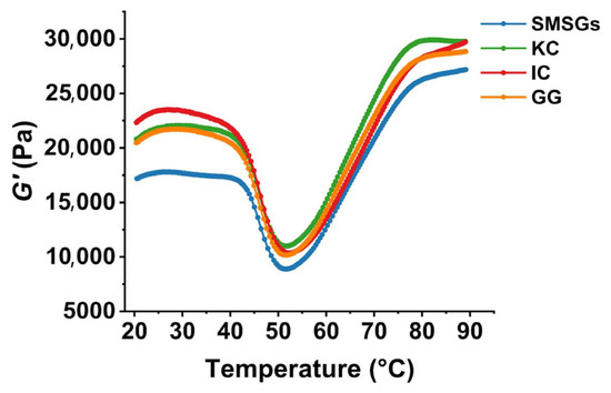 The changes in viscoelasticity during the process from sol to gel of surimi samples can be detected by dynamic rheology [32]. The storage modulus (G′) is a vital index to describe the unfolding and aggregation processes of surimi proteins during the heating process [35]. As shown in Figure 3, SMSG-based samples exhibited similar gelation patterns characterized by three stages of gel formation, gel weakening, and gel enhancement. During the initial heating phase, G′ increased slowly and peaked at around 30 °C, mainly due to the aggregation of partially unfolded actomyosin, thus forming a preliminary gel network via hydrogen bonds [41]. Afterwards, G′ began to decrease with the increasing temperature until heating to around 52 °C, attributing to the heating breaking of hydrogen bonds and myosin degradation resulting from the heat-activated endogenous proteases [42]. As the temperature continued to rise to 90 °C, the G′ exhibited a further elevation, indicating the formation of a stable gel structure [43]. After adding polysaccharides, G′ was significantly higher than that in SMSGs during the whole heating stage (Figure 3). In detail, the increasing folds of the KC-, IC-, and GG-treated groups were 1.09, 1.09, and 1.06 in comparison to SMSGs at 90 °C, respectively, suggesting the promotion effect of polysaccharides on strengthening network structure formation during the gelation process. Similarly, Zhang et al. [40] and Zhu et al. [2] have studied surimi gelation improvement by curdlan and konjac glucomannan treatments, where G’ was significantly higher after polysaccharide addition, indicating the enhancement of the thermal stability of surimi proteins modified by curdlan and konjac glucomannan. Therefore, it is suggested that KC, IC, and GG could promote the suitable denaturation and aggregation of surimi proteins, leading to the enhancement of the thermal stability and elasticity of SMSG-based samples.
