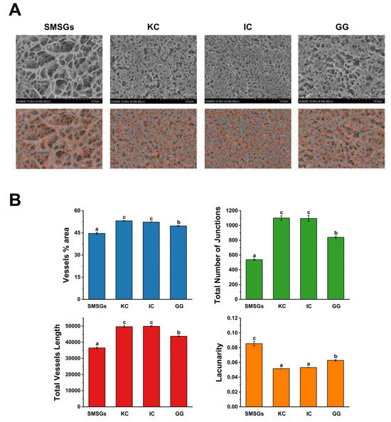 Figure 4. Microstructures of SMSGs modified by KC, IC, and GG. (A) Cryo-SEM images. (B) Quantitative network analysis parameters including vessel area (yellow lines), total number of junctions (blue dots), total vessel length (red lines), and lacunarity (empty areas). Different letters (a–c) suggest significant differences (p < 0.05) among the groups.