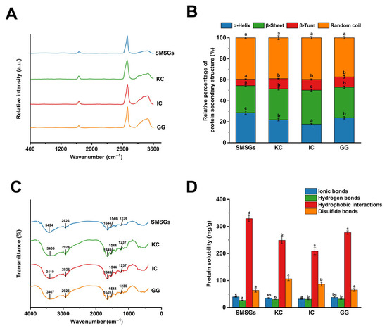 Figure 5. Conformational properties and molecular interactions of SMSGs modified by KC, IC, and GG. (A) Raman spectra. (B) Protein secondary structure. (C) FTIR spectra. (D) Chemical forces. Different letters (a–d) suggest significant differences (p < 0.05) among the groups.