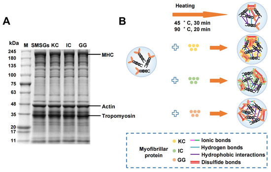 Figure 6. (A) SDS-PAGE and (B) mechanism diagram of SMSGs modified by KC, IC, and GG.
