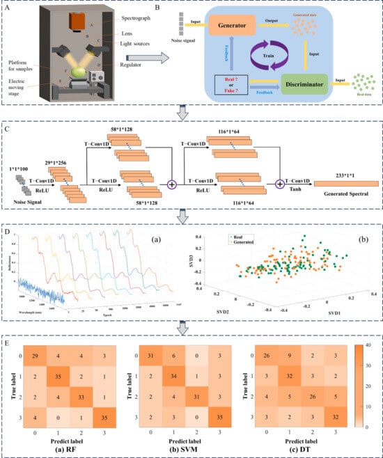 A typical flow chart of spectroscopy technology combined with machine learning for pesticide residue detection [16]. (A) Scheme of spectrometer; (B) The architecture of generative adversarial networks to obtain the spectral datasets; (C) The improved generator; (D) The spectrum generated by improved generative adversarial networks (a) and visualization of generated spectra (b); (E) The confusion matrix of classification results on spectral dataset.