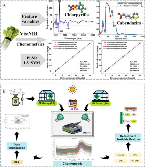 (A) Spectral analysis of pesticide residues in Chinese cabbage by VIS/NIR spectroscopy [22]; (B) Identification of chlorpyrifos residues on Chinese cabbage by combining NIRS with PLS-DA, SVM, ANNs, and principal component ANNs [24].