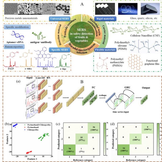 (A) The binding mechanism of detection materials and carrier materials for the identification of pesticide residues in fruits and vegetables using SERS [31]; (B) (a) The MC-CNNs-GRU discrimination model for pesticide/fungicide residues; (b) The t-SNE analysis results of the MC-CNNs-GRU model; (c) The confusion matrix of the training set and (d) the test set [32].
