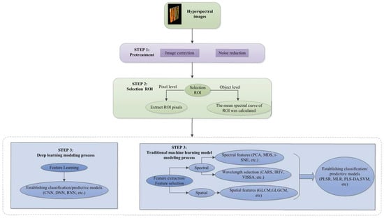 When combined with deep learning, HSI technology can automatically extract complex spectral features, optimize model performance, and improve detection accuracy and generalization ability. However, the spectral cube data collected by HSI systems is relatively complex. Therefore, to accurately extract spectral data, relevant processing of the original image is required [49].