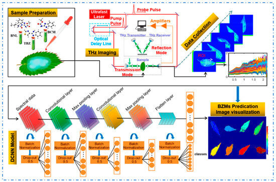 The flowchart of detecting multiple benzimidazole pesticide residues in Toona sinensis leaves using terahertz imaging and deep learning [59].