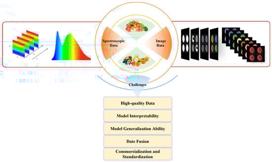 The integration of spectroscopy and imaging technologies in the detection of pesticide residues in fruits and vegetables faces numerous challenges. There are significant differences between spectroscopy and imaging techniques in terms of data acquisition frequency and resolution, which makes it difficult to match information during data fusion, leading to the loss of critical information. Image data and spectral data have different characteristics and dimensions [77,78]. Effectively fusing these with distinct features and dimensions, and extracting valuable information for pesticide residue detection, is one of the research difficulties. Existing data fusion algorithms are mostly feature-based, but they struggle to fully exploit the intrinsic connections between them in practical applications, resulting in suboptimal detection accuracy after fusion. Moreover, the quality of data obtained from different spectroscopic and imaging techniques varies, making it challenging to effectively integrate these disparate datasets. Complex real-world application scenarios further exacerbate this challenge [79]. Additionally, there are significant differences in data acquisition methods between imaging and spectroscopic instruments, which also pose numerous difficulties in integrating data into a single detection system.