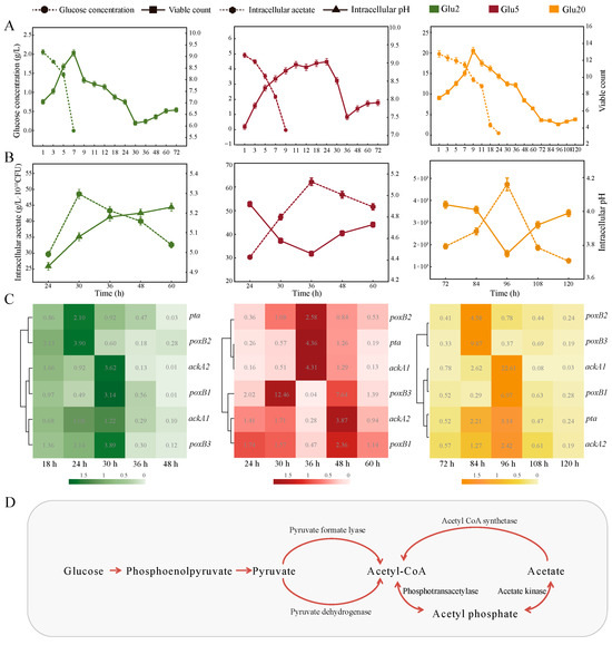 The number of viable HD1.7 in Glu2, Glu5, and Glu20 increased and then decreased (up to a maximum of 1.43 × 109 ± 3.68 × 108, 1.08 × 109 ± 6.45 × 107, and 1.39 × 1013 ± 1.18 × 1012), showing an increase again in 30, 36, and 96 h (6.35 × 105 ± 3.81 × 104, 1.54 × 106 ± 9.24 × 104, and 2.75 × 104 ± 1.65 × 103), respectively. This secondary growth proved the backup carbon source role of acetate (Figure 1B). The intracellular pH also increased to 5.23 ± 0.02 (60 h in Glu2), 4.72 ± 0.03 (60 h in Glu5), and 3.99 ± 0.02 (120 h in Glu20) with the depletion of intracellular acetate (Figure 1A).
