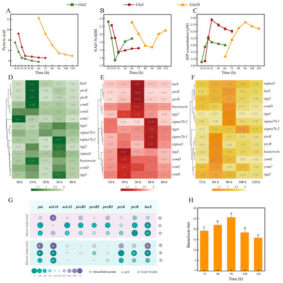 Variation in energy, AMRGs, and QSRGs abundance before and after “acetate switch” points. (A) Changes in pyruvate in the three treatments over time; (B) Changes in NAD+/NADH in the three treatments over time; (C) Changes in ATP in the three treatments over time; (D–F) Heat map of the expression of QSRGs in the three treatments over time; (G) Heat map of correlation analysis of QSRGs with acetate and energy before and after the “acetate switch”; (H) Bacteriocin titer of HD1.7 in Glu 20. “*” indicates “p < 0.05”; Different lowercase letters indicate significant differences among groups (p < 0.05).